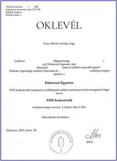 A Debreceni Egyetem, mint felnőttképző intézmény (E/2020/000164) 2025.02.05.-ei dátummal akkreditálta a Tűzvédelmi előadó felnőttképzést, mely képzés keretein belül az EHS szakirányú továbbképzésen szerzett Tűzvédelem I. és Tűzvédelem II. tárgyak eredményes teljesítésével megszerzett szaktudás (A megszerzett tudás igazolására szolgáló dokumentum: Neptun elektronikus tanulmányi rendszer hitelesített törzslap kivonata) beszámítható a Tűzvédelmi előadó elméleti és gyakorlati ismeretei 1. foglalkozás képzési rész terhére (300 óra teljes óraszámból 240 óra beszámítása). Azaz a fenti ismeretbeszámításhoz kapcsolódóan a Tűzvédelmi előadó elméleti és gyakorlati ismeretei 2. foglalkozás teljesítésére 60 órás kiegészítő képzést indítunk.