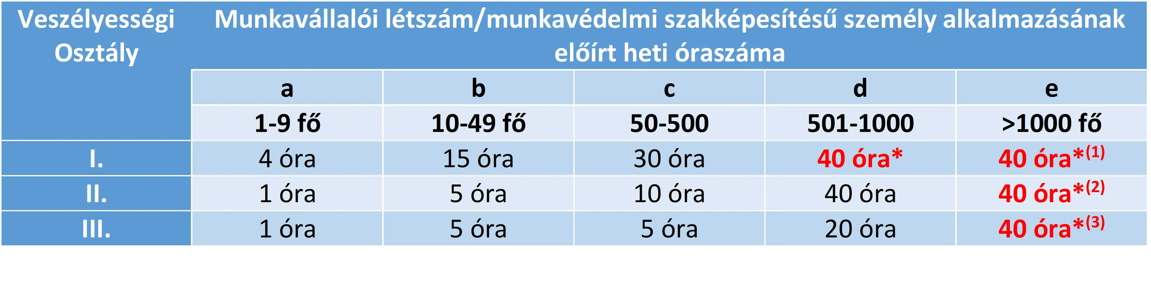Legalább 50 főt foglalkoztató munkáltatóknál az I. veszélyességi osztályba sorolt tevékenységek esetén felsőfokú munkavédelmi szakképzettséggel látható el. |