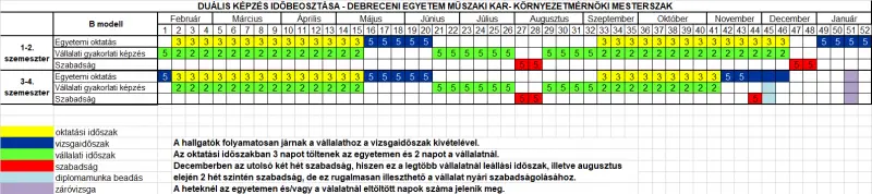 A képzés duális jellege abból adódik, hogy a gyakorlati oktatás a Debreceni Egyetem Műszaki Karán kívül – a képzési idő felében – Partnervállalatainknál történik. A duális hallgató a szorgalmi időszakot a „hagyományos” nappali munkarendű hallgatóval együtt végzi a felsőoktatási intézménynél (intézményi szakasz). A szorgalmi időszak alatt, heti két napot tölt a hallgató a partnervállalatnál. A hallgatók a tanulmányok ideje alatt hallgatói munkavállalói státuszban vannak, és fizetést kapnak.